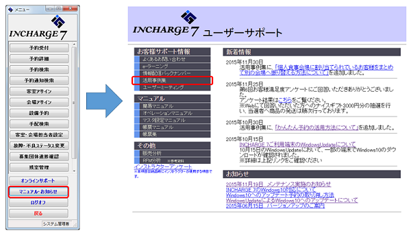INCHARGE 7メニュー画面のマニュアル・お知らせページに