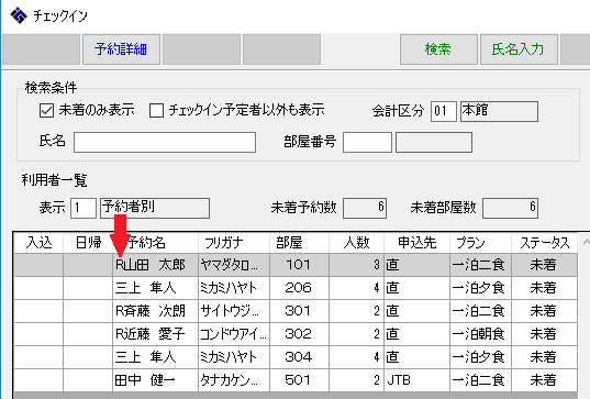 ・「予約検索」「客室アサイン:予約一覧」「C/IN:利用者一覧」などの一覧表示にて「フリガナ」の先頭にステータス情報が追加された状態で表示されます。