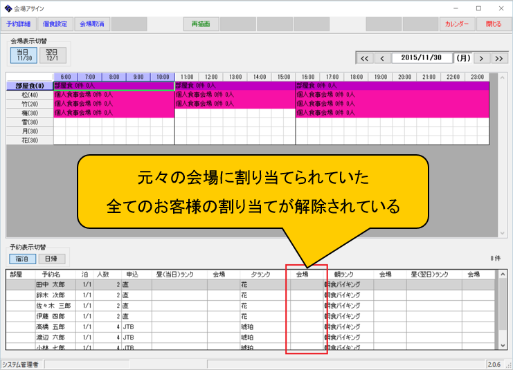 画面下半分の一覧では、会場の割り当てが無くなったお客様を確認できます。(手順1の図と比較してみてください。)