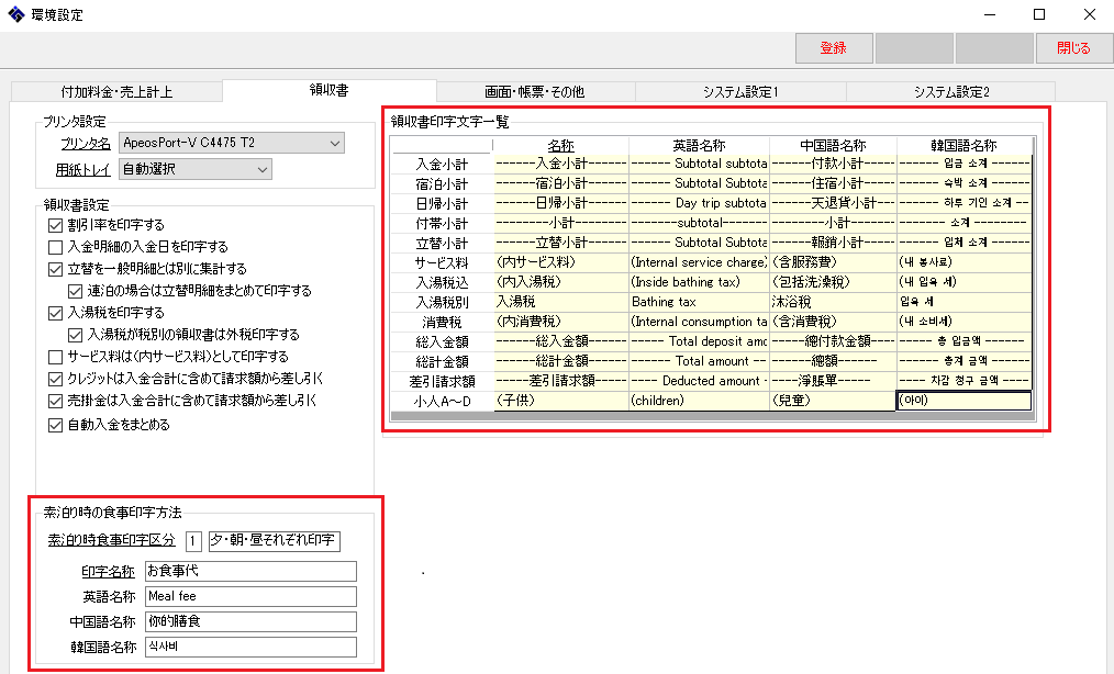 ・環境設定の領収書タグにて領収書印字文字一覧・素泊まり時の食事印字方法を設定し登録を行ってください。
