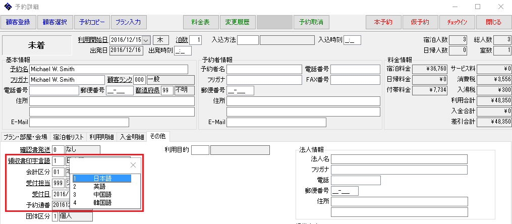 ・予約詳細のそのタグの領収書印字言語を切替る事により領収書印字を指定した外国表記とする事ができます。