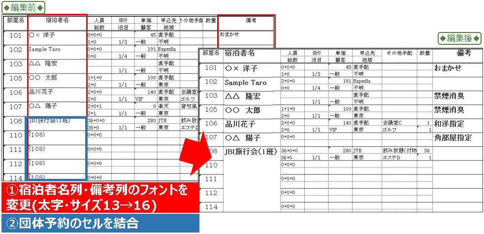 「客室台帳の宿泊者名欄と備考欄」について、Excelにて出力した後に、以下のような加工をすることで、見やすくなります。