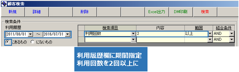 顧客検索画面から、対象顧客を絞込みしたDMタックシールの発行が可能です。