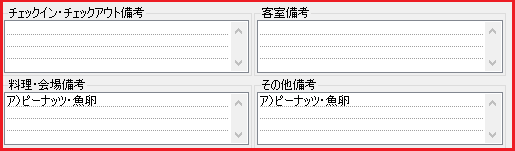 ・「チェクイン・チェックアウト備考」「客室事項・料理・会場備考」「その他備考」に登録した内容が出力されます。